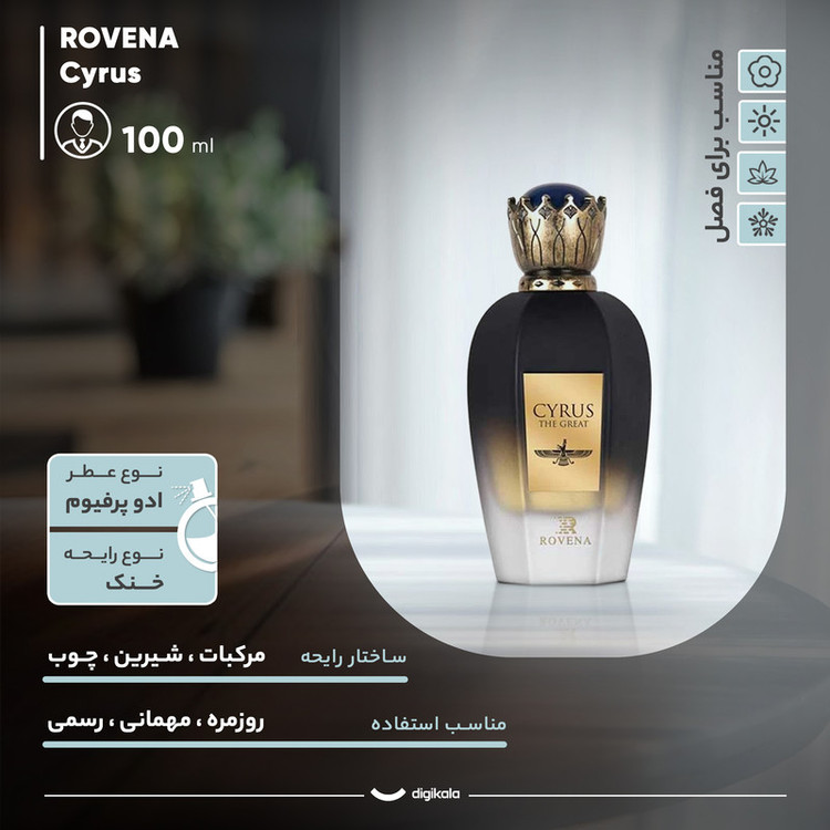 ادکلن مردانه روونا Cyrus با رایحه تند و خنک وپخش بو و ماندگاری مناسب به قیمتی اقتصادی عرضه شده است بسته بندی زیبا از شاخصههای این محصول است و مناسب هدیه به آقایانی است. این عطر مشابه ادکلن اینوکتوس است. این ادو پرفیوم مردانه عطری است مردانه و انرژیک. محصولی تازه ، بی نظیر ، خنک و تندی است که سمبلی از قدرت ، تحرک و انرژی است. این عطر که در قلب ترکیباتش نتهای خنک دریایی ، گریپ فوروت و برگ را داراست بهترین انتخاب برای روزهای گرم تابستانی است.