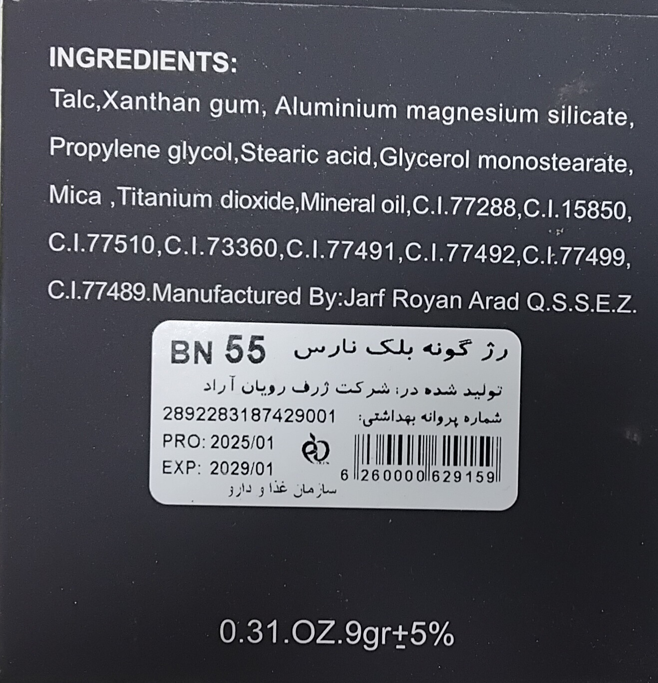 رژگونه بلک نارس دارای پودری فشرده است که جلوه شاداب و جذابی روی سطح پوست ایجاد میکند. رنگدانههای پودری بسیار نرم و ابریشمی رژگونه بلک نارس در رنگهای مات و براق موجود هستند. این سایه های نرم قابلیت ترکیب بسیار بالایی داشته که رنگ جذاب و زیبایی روی پوست به وجود میآورند که همگی ته رنگ صورتی داشته و جلوهای بسیار طبیعی به آن میدهند. ژگونه بلک نارس با رنگهای منحصر بفردی که دارد برای کانتور نیز قابل استفاده هستند. همین ترکیب روی پوستهای تیرهتر درخشش و برق بیشتری به پوست داده و چهره را بشاشتر جلوه میدهد.